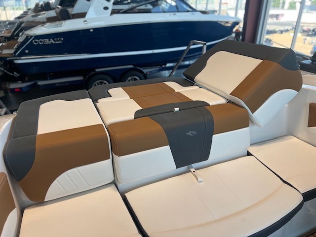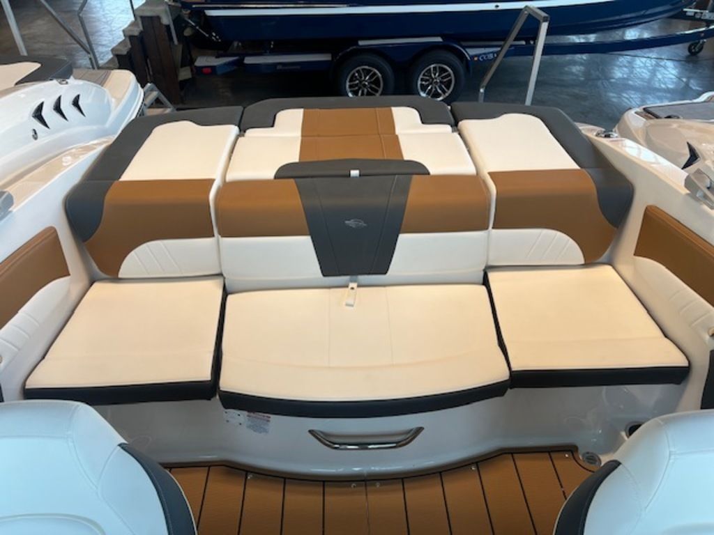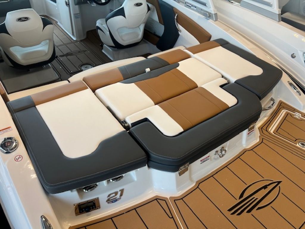- Cockpit Layout: Two Bucket Seats (Slide and Swivel) with Logo Badging, Rear Bench Seat and Aft Hinged Sundeck with Walk-Thru, Lounge Position and Aft Facing Seat