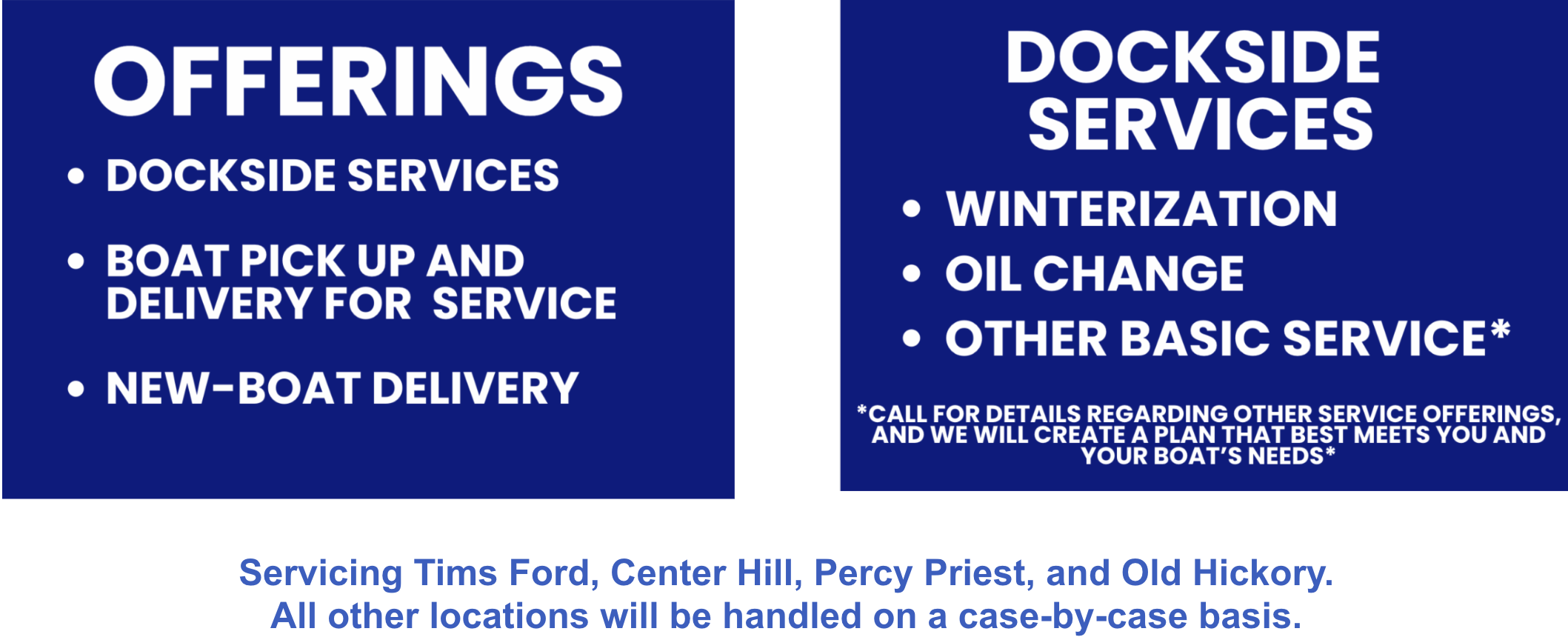 Mobile & Dockside Service As of 2025, we're bringing our services to you! Our mobile service team provides basic engine maintenance, including oil changes and winterizations, right at the dock. We currently serve the following lakes: